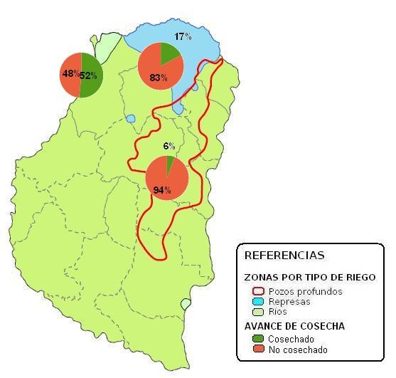 La zona de riego por río/arroyo es la que mayor avance alcanzó llegando al 52%; este sector abarca el 10% del total de la superficie sembrada en el presente ciclo, ver Mapa Nº 2.