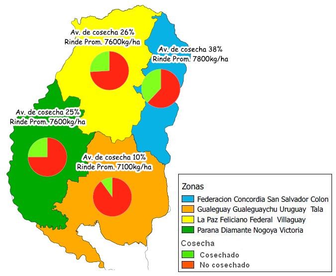 A nivel departamental, el mayor progreso en las labores corresponde a La Paz, que alcanzó el 51%; en el otro extremo se ubican: Gualeguaychú y Uruguay donde aún no se ha dado inicio a la zafra.