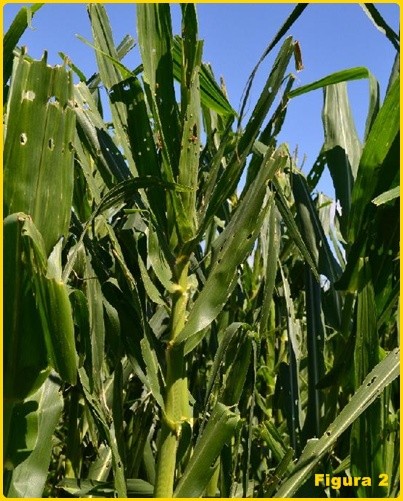 Los maíces tardíos evaluados en los Dptos. Tala, Nogoyá, Victoria, Diamante y Paraná se encuentran en estados reproductivos, entre VT (panojamiento) y R4 (grano en madurez pastosa) y el aspecto general es de regular a muy bueno (Figura 1). Los lotes afectados por “cogollero” presentan un estado general regular, ya que a los daños del insecto se sumaron los efectos de los “temporales” que dejaron las hojas destruidas y con aspecto “deshilachado” (Figura 2). A pesar de la importancia de las heridas, no se observa un aumento de las bacteriosis que afectan al maíz.