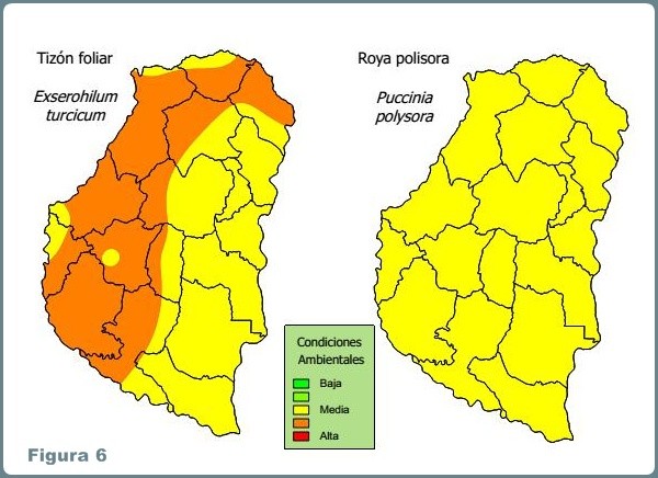 El mapa de riesgo de las enfermedades foliares en maíces tardíos realizado en base a los datos climáticos registrados entre el 23 y 29 de febrero, muestra una moderada probabilidad para la aparición o mayor desarrollo del tizón foliar en todo el Este y algunos departamentos en el Centro de Entre Ríos; para roya polisora, la probabilidad es baja en toda la provincia.