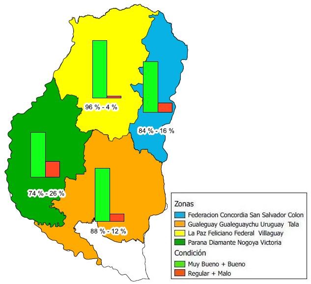 Como se puede observar en el Mapa Nº 3, la zona Norte es la que mejor condición presenta, con el 96% dentro de la categoría de bueno a muy bueno y el 4% de regular a malo. Todas las zonas presentaron una mejoría luego de las lluvias, pero la misma no logrará recuperar la pérdida de rinde potencial.