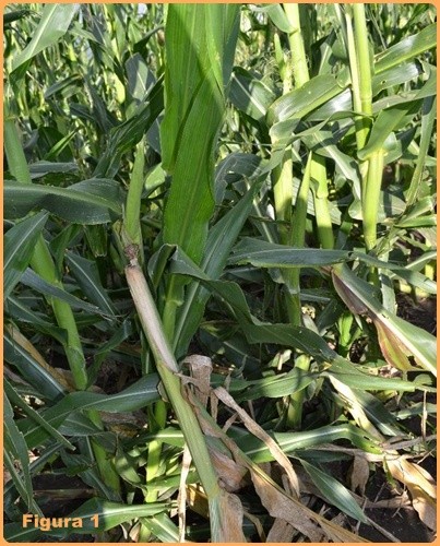 Los maíces tardíos evaluados en los Dptos. Paraná, Diamante, Victoria y Gualeguay se encuentran entre R2 (grano ampolla) y R6 (madurez fisiológica). El aspecto general es variable, algunos buenos a muy buenos y otros, enmalezados, tallos quebrados (Figura 1) y con síntomas severos de rayado bacteriano (Figura 2).