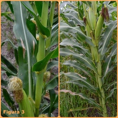 El 90% de los lotes visitados presentaban síntomas de tizón foliar (Exserohilum turcicum), en algunos casos como en los Dptos. Victoria (Figura 3) y Gualeguay, con alta incidencia y severidad superior al 15%.