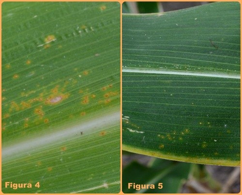 Entre otras enfermedades foliares se encontró roya polisora (Puccinia polysora) (Figura 4) con mayor frecuencia, escasa roya común (Puccinia sorghi) y en algunos casos, mancha ocular (Kabatiella zeae) (Figura 5).