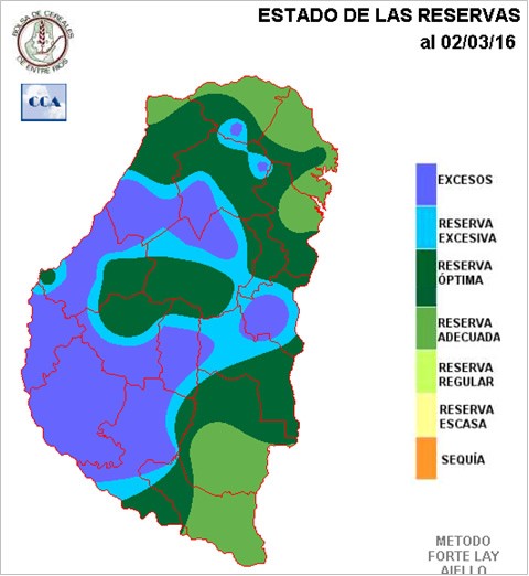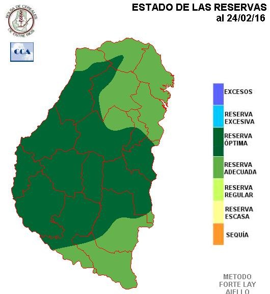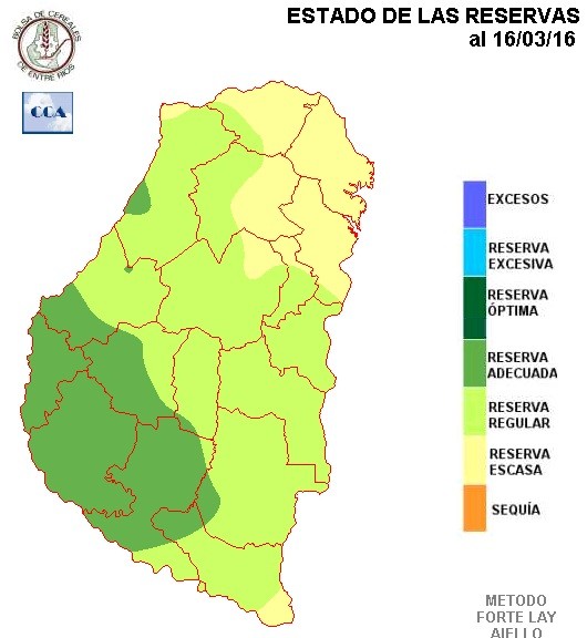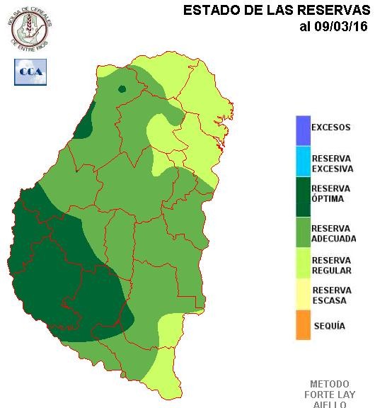 Con el transcurso de una semana seca, las reservas regulares comienzan a ganar territorio. Debemos considerar que para cultivos terminados, listos para cosecha, la situación de una pradera con demanda hídrica constante, posiblemente subestime la disponibilidad de humedad. Por otra parte la semana que hemos transitado no ha sido exigente desde el punto de vista térmico y por lo tanto es razonable suponer que las reservas adecuadas pueden cubrir un territorio mayor. Lo que sí es muy probable que ya no haya situaciones con excesos hídricos, salvo en algunos bajos muy marginales. Es decir la situación es más que apta para la cosecha.