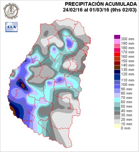 La campaña prácticamente está cerrada en cuanto a lo que puedan demandar los cultivos, sin embargo las precipitaciones no pueden quedar tan atrasadas respecto de los valores normales. En este sentido el arribo de un sistema frontal frío durante la jornada de mañana, seguramente inestabilizará las condiciones meteorológicas favoreciendo el desarrollo de tormentas y lluvias de variada intensidad. En principio los máximos pluviales no se ubicarán sobre la provincia de ER, sin embargo pueden concretarse promedios areales cercanos a los 25 milímetros. Posiblemente las tormentas sean más intensas en los departamentos del norte, donde los acumulados pueden lograr superar el promedio citado.