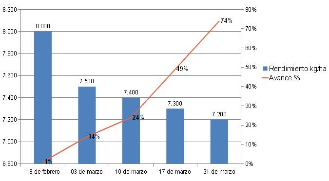 Como se puede observar en el Gráfico Nº1 el rendimiento promedio provincial ha ido cayendo a lo largo de la cosecha, con un rinde inicial de 8.000 kg/ha hasta llegar al día de la fecha con un valor promedio de 7.200 kg/ha.