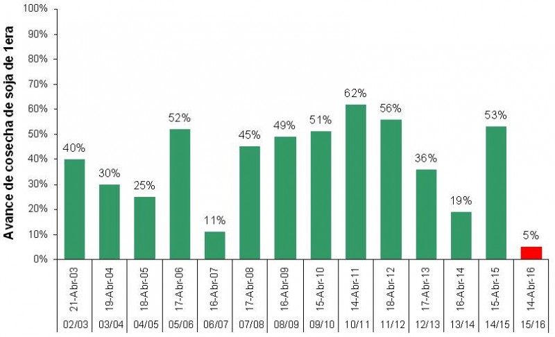 Tal como puede apreciarse el progreso logrado es el más bajo de los últimos 14 años, con tan solo 5% de la superficie de soja de 1era trillada, es decir menos de 60.000 ha sobre un área de 1.174.300 ha.
