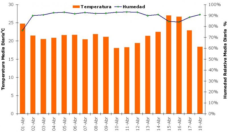 Observándose un desvío de 3.4 oC en el promedio de la temperatura (18, oC versus 21,6 oC) y en lo que respecta a la humedad relativa el valor promedio diario es de 79% mientras que del 1 al 18 de abril ha promediado 90%.