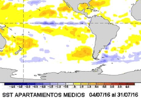 Desde el mes pasado, las temperaturas superficiales del Pacífico Ecuatorial central, han mostrado una leve tendencia a desviarse hacia un enfriamiento. Podemos decir, en este comienzo de agosto, que a lo largo del mes de julio esta tendencia ha sido persistente, pero también muy débil. En el promedio de las últimas cuatro semanas de julio se nota una franja fría a lo largo de la línea ecuatorial, pero difícilmente ésta pueda clasificarse como una evidencia de un evento La Niña en curso. La señal es baja y por lo pronto no reviste mayor preocupación.