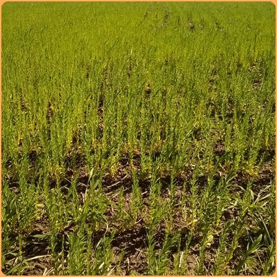 La condición general del lino en la provincia es buena en los lotes que fueron sembrados en fecha óptima y en los cuales el estado fenológico se corresponde con ramificación (8-10 cm.). En cambio, la condición se presenta como regular en las siembras tardías con bajo stand de plantas y transitando las primeras etapas vegetativas (Foto N° 2).