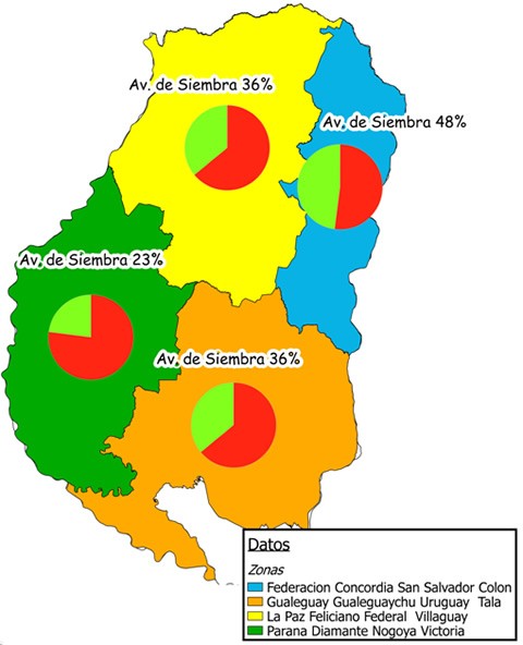 La oferta de agua no fue todo lo generosa que demandaba el retroceso de las reservas superficiales que dejó el mes de agosto, principalmente en el sudoeste de la provincia. Las lluvias en general en este sector fueron débiles, apenas superadoras de los diez milímetros y si bien esto representa un auxilio, las expectativas estaban puestas en lograr al menos el doble de este volumen de agua. Claramente el corredor que va desde Concepción del Uruguay a Concordia fue el que obtuvo los acumulados que más favorables y además los que perfilan un paso más aliviado para el mes de septiembre.