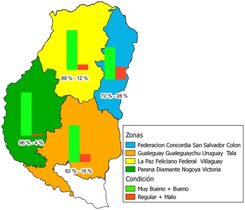 En base a consultas efectuadas a la Red de Colaboradores se determinó que el 14% del área posee una condición general evaluada como muy buena, el 75% presenta una situación buena y el 11% restante fue calificada como regular. El principal inconveniente dentro de este grupo se asocia a lotes con baja densidad de plantas efecto de los excesos hídricos al momento de la siembra. En el Mapa Nº 1 se puede apreciar la condición del cereal por zonas.