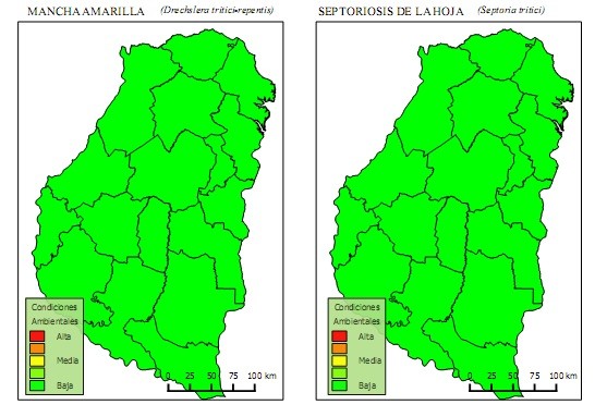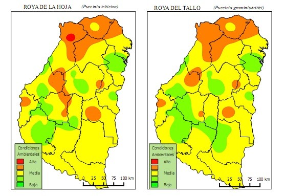 Los mapas indican el riesgo de ocurrencia de enfermedades foliares y del tallo del trigo en base a determinados factores climáticos ocurridos en los últimos 9 días.