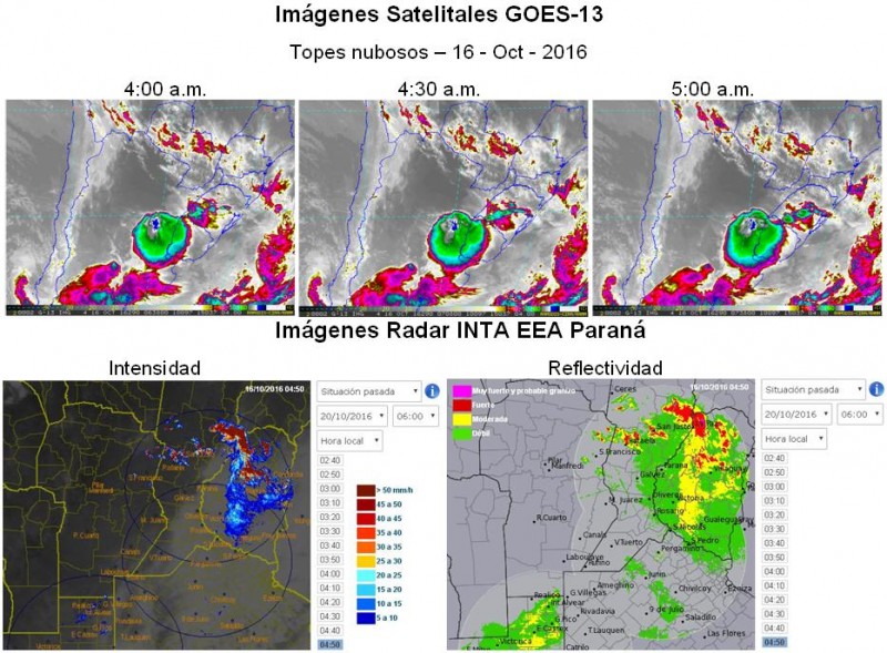 Por otra parte, se anexa las imágenes correspondientes al radar ubicado en la EEA Paraná de las 4:50 a.m. donde se visualiza la intensidad y reflectividad del evento.