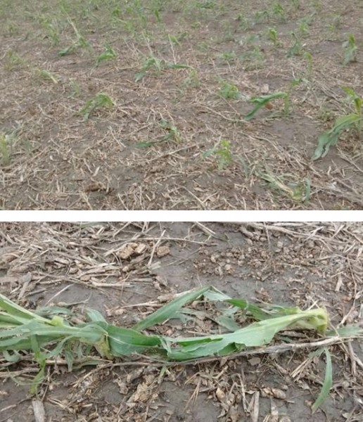 Los Colaboradores mencionan que todavía no se ha podido evaluar el impacto de la granizada sobre los cultivos, a continuación se publican dos fotografías sobre el efecto del evento en un lote implantado con maíz.