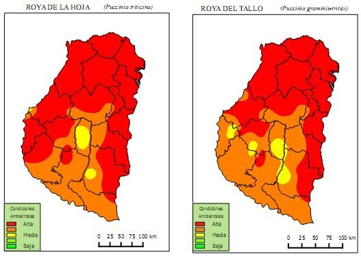 Las condiciones ambientales son altamente conductivas para roya de la hoja (Figura 1) y en días determinados, eventos infectivos para roya del tallo (Figura 2), alcanzando niveles moderados a bajos de severidad, sin embargo, valores altos en variedades susceptibles.
