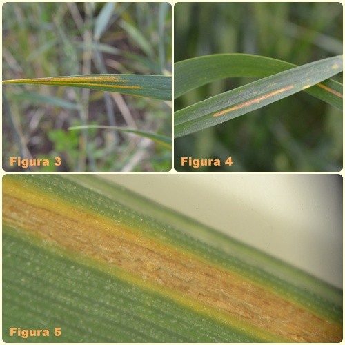 Lotes con variedades susceptibles a roya amarilla continúan con abundante esporulación en uredios ya formados (Figura 3), sin embargo, en general el avance de la enfermedad es más lento. La mayoría de los lotes afectados y de conocida susceptiblidad fueron tratados químicamente y se observó una excelente respuesta a los fungicdas (Figuras 4 y 5).