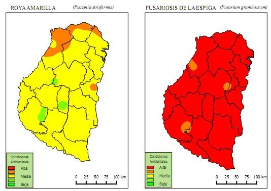 Los mapas indican el riesgo de ocurrencia de enfermedades foliares y del tallo del trigo en base a determinados factores climáticos ocurridos en los últimos 8 días, del 10 de octubre al 18 de octubre de 2016. Los trigos analizados en los dptos. Paraná y Diamante se encuentran en estados fenológicos que van desde espigazón (EC 50) a granos en madurez lechosa (EC 70).