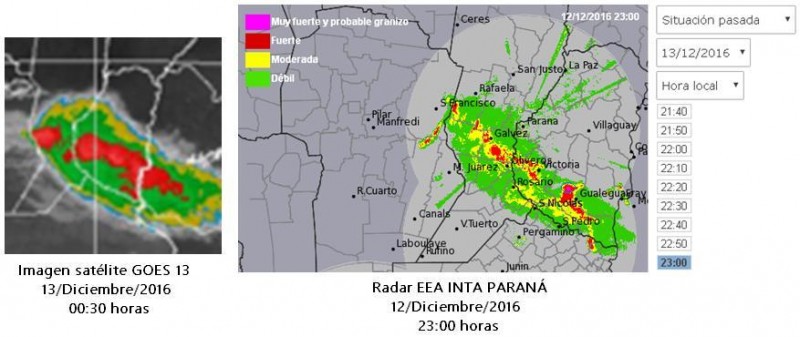 En las siguientes imágenes se puede apreciar el ingreso del frente de tormenta en el territorio provincial proveniente del satélite GOES 13 y la zona afectada por el granizo visualizada a través del radar de la EEA INTA Paraná.