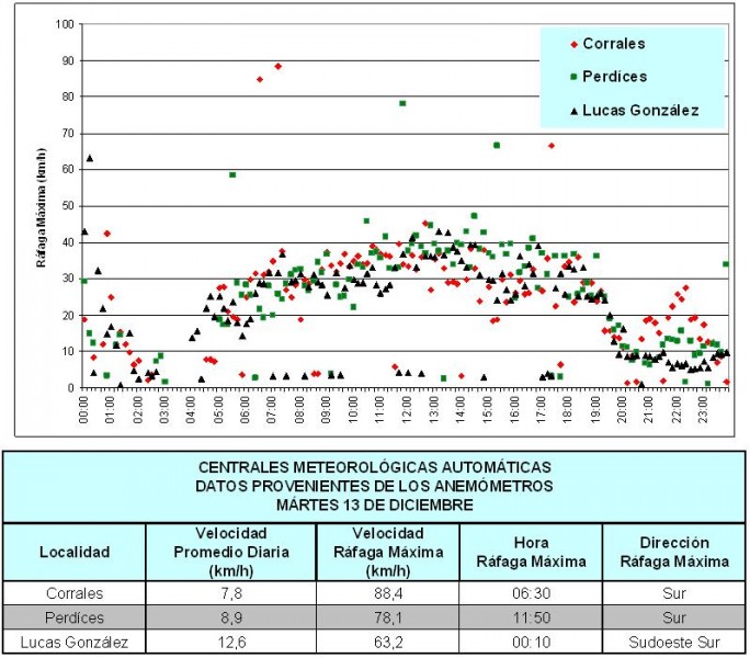 En base a los datos obtenidos de la Red de Centrales Meteorológicas Automáticas (que cuentan con anemómetros) ubicadas en el sur del territorio se elaboró el Gráfico N° 1.