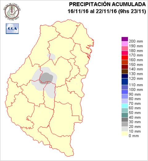 El evento fue de dimensiones pequeñas y se focalizó en el centro del departamento Gualeguay y tuvo como resultado la pérdida de aproximadamente 2.000 ha de soja y 100 de sorgo.