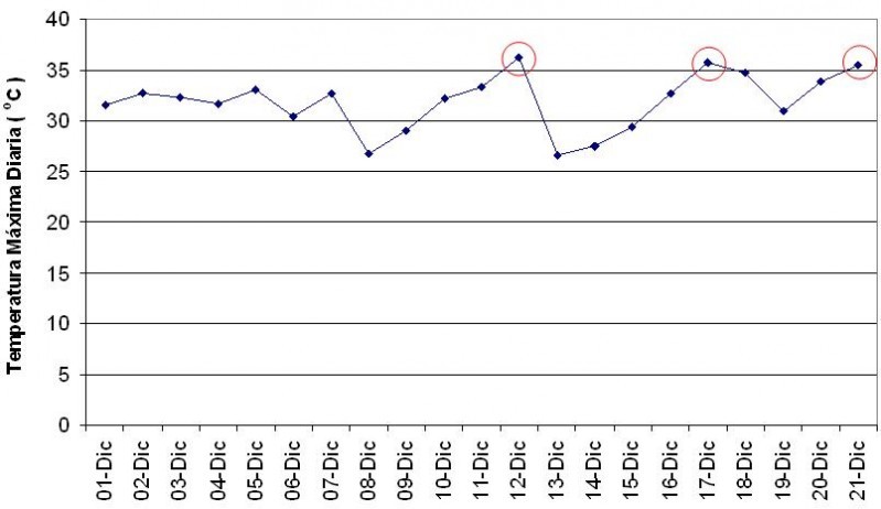 El gráfico Nº1, elaborado a través de los datos la Red de Centrales Meteorológicas Automáticas de la Bolsa de Cereales de Entre Ríos, describe el comportamiento de la temperatura máxima diaria del mes de diciembre hasta el día de la fecha. En el mismo se puede observar que solamente se registraron tres días con valores que superaron los 35ºC. Es generalizado utilizar dicho valor como nivel umbral a partir del cual puede haber daños irreversibles en el crecimiento y desarrollo de las plantas debido al estrés por calor.