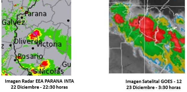 El pasado jueves 22 de diciembre, alrededor de las 23:00 horas, se registró la caída de granizo en las cercanías de la ciudad de Aranguren. A continuación se muestran imágenes provenientes del Radar de INTA EEA PARANA y del satélite GOES – 12.