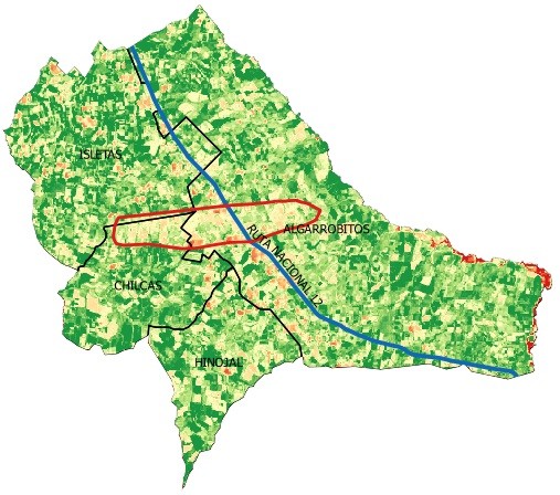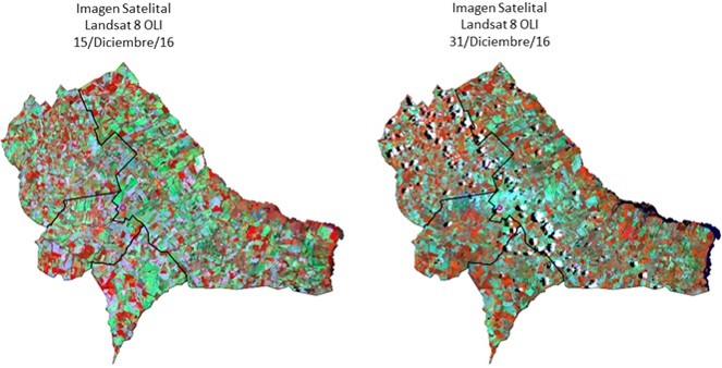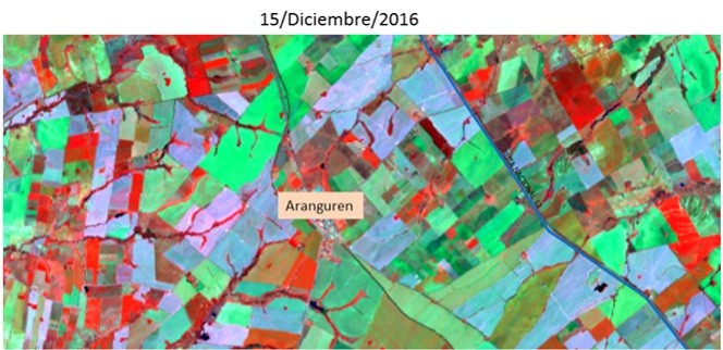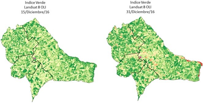 Se generaron dos índices verdes, que reflejan el vigor de la vegetación para las dos fechas. Los tonos amarillentos en las cercanías de Aranguren responden a vegetación severamente afectada por el granizo.