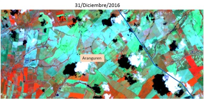 La zona donde el granizo generó severos daños abarcó un área de aproximadamente 8.200 hectáreas (ha), esto ha sido determinado con imágenes provenientes del satélite Landsat 8 OLI de fechas 15 de diciembre (antes del evento) y del 31 de diciembre de 2016 (posterior al evento). Cabe mencionar que el área con daño de granizo de menor impacto puede ser mayor a lo delimitado con información satelital.