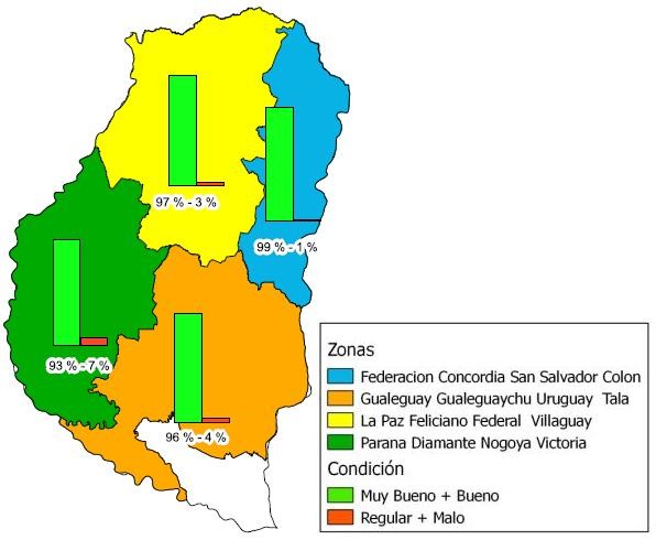 La zona productiva principal de la provincia, ha logrado acopiar un nivel de reservas muy satisfactorias. Se sabe que los pesados suelos entrerrianos requieren importantes aportes pluviales como para no ver resentido el perfil de humedad en esta época del año. Es más, es poco frecuente ver la provincia con una extensión tan vasta de excesos en esta época del año.