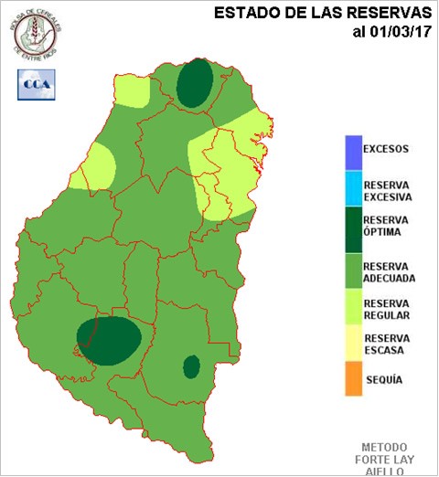 Respecto de la semana pasada y de acuerdo a la pobre oferta de agua de los últimos siete días, es natural que las reservas hayan retrocedido. Hasta podríamos decir que el retroceso es significativo si consideramos que al miércoles de la semana pasada gran parte de la provincia presentaba suelos saturados. Justamente este sobrante de humedad, ha permitido sobrellevar exitosamente el riguroso ambiente con que cerró febrero, observándose al presente un predominio de reservas que para una pastura alcanza valores adecuados.