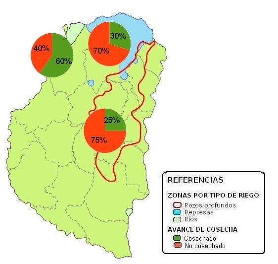 En el mapa N° 1 se muestra el grado de avance de cosecha por zonas en la provincia. El mayor progreso corresponde al sector norte con un avance del 83%, mientras que la zona oeste alcanzó sólo el 52%.