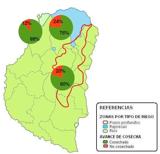 Como se puede observar en el mapa N° 1, la zona con riego de río y/o arroyos es la que presenta mayor progreso, pero en general los valores son bastantes similares en las tres zonas.