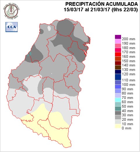 Hacia la tarde del sábado comenzaron a desarrollarse tormentas sobre el sudoeste, promovidas por la posición del sistema frontal sobre el norte de BA. Las precipitaciones se fueron generalizando durante la madrugada del domingo y se proyectaron disminuyendo su intensidad con el correr de aquella jornada. Sobre el oeste sudoeste las precipitaciones más abundantes se ubicaron sobre el departamento Paraná, las cuales fueron configurando un mínimo sobre la zona central de la provincia. Un comportamiento totalmente distinto se observó en el nor noreste de la provincia, el cual se acopló a la importante oferta de agua que se concretó sobre el sur correntino. El centro de Feliciano recibió precipitaciones superiores a los 120 milímetros.