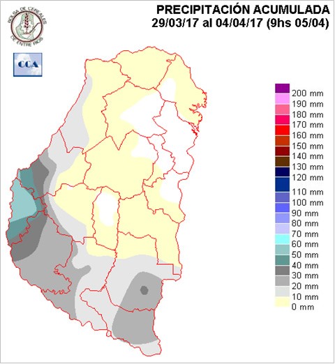 El cambio de ambiente observado tras el pasaje frontal se fundamente en quiebre de la circulación del noreste que había predominado desde la última semana de marzo. Recordemos que en la segunda decena de días del mes pasado, se apreció un primer indicio de transición estacional que no logró afianzarse, lo cual reposicionó los temores sobre la repetición de abril del año pasado. Los temores eran razonables y si bien la provincia de ER no ha tenido que lidiar con lluvias desmesuradas en el último evento, otros sectores de la región pampeana han sufrido inundaciones y excesos significativos que pueden redundar en pérdidas de importancia.