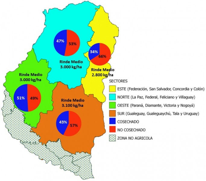 En el ámbito provincial se cosechó el 46% (440.000 ha) de la superficie cultivada que es de 966.000 ha. Cabe mencionar que debido a la mayor cuantía de las precipitaciones, el sector Este posee un menor avance en las labores con el 34% (Mapa Nº 1).