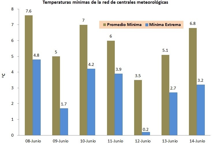 El lunes 12 se presentó como el día más frío de la semana, ya que el promedio de la temperatura mínima de la Red de Centrales Meteorológicas fue de 3,5 oC y el valor más bajo de se ubicó en 0,2 oC (ver gráfico No 1).