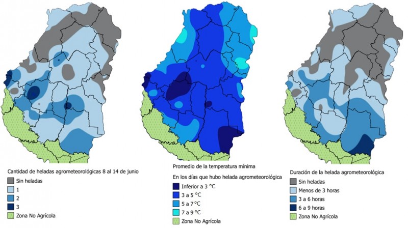 La duración de la helada meteorológica para el día más frío (lunes 12 de junio) se presenta en el mapa No 3, con un máximo entre 6 a 9 horas en el extremo Sureste del territorio.