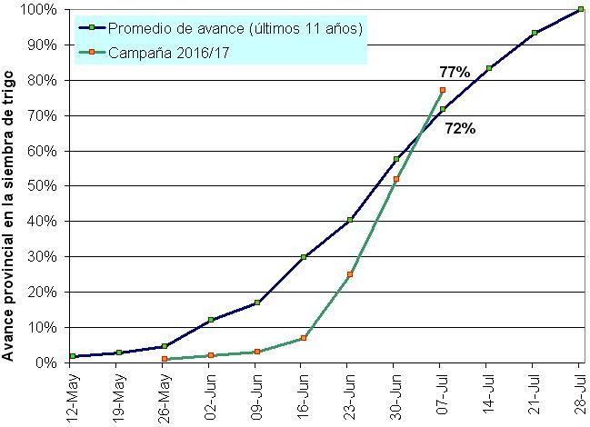 Las escasas precipitaciones en las últimas tres semanas han permitido sostener un buen ritmo en las tareas de siembra de trigo (ver gráfico No 1). No obstante, los Colaboradores reportan que se observa una caída en la intención original (planificada a inicios de mayo) versus lo observado en la primera semana de julio. Actualmente se proyecta una superficie que se ubicaría en un valor similar a la del ciclo 2016/17 (267.100 hectáreas).