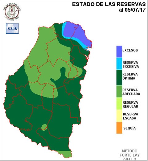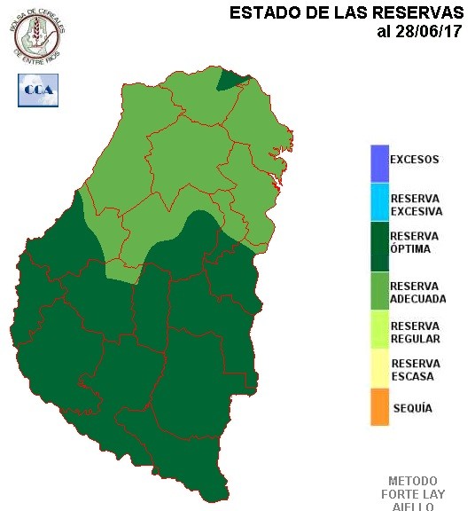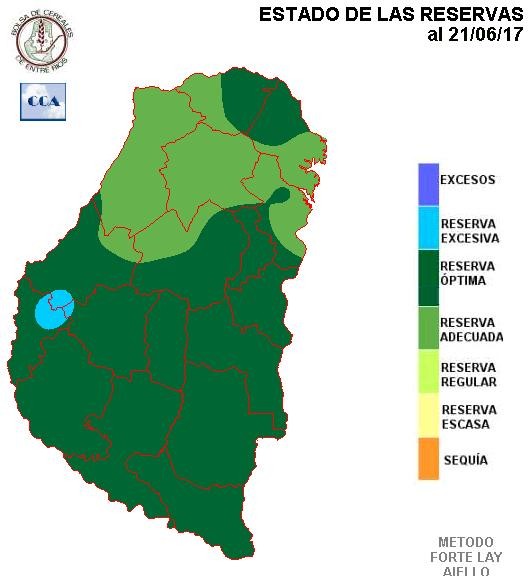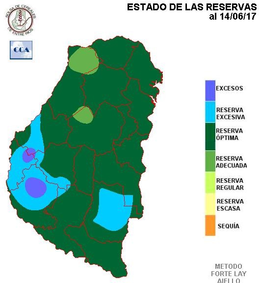 Aun con lluvias por debajo de los valores normales, la secuencia de mapas de reservas que hemos ido mostrando en las últimas semanas, nunca han caído por debajo de un nivel adecuado. Es lógico que en el noreste provincial aparezcan excesos con lluvias superiores a los cuarenta milímetros