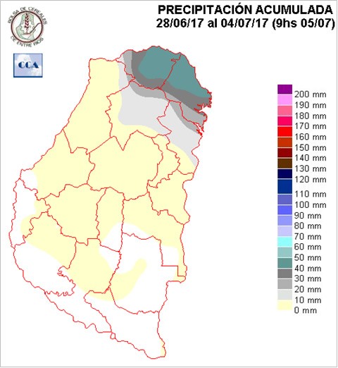 Las precipitaciones representadas en el mapa corresponden principalmente a las últimas jornadas de junio, más que nada el miércoles y jueves de la semana pasada. El norte provincial, principalmente el este, se acopló a los importantes sistemas precipitantes que se observaron en el sur de la provincia de Corrientes, mientras que en el resto del territorio entrerriano las precipitaciones fueron mayormente insignificantes. Estas lloviznas o lluvias menores, por lo general quedan registradas por las estaciones automáticas, dado que la suma de milimetrajes muchas veces es exigua como para quedar registrada por un pluviómetro convencional o en muchas ocasiones no es tenida en cuenta como dato relevante.