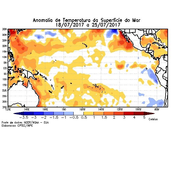 La primera consideración es «mirar» lo que pasa en el Pacífico Ecuatorial Central, región oceánica donde se desarrolla el ENSO (El Niño Oscilación del Sur) y la Figura al final de este informe nos muestra las condiciones actuales, que son decididamente de NEUTRALIDAD, o sea, no hay NIÑO ni NIÑA, apenas un leve calentamiento que se mantendrá durante los próximos 3 meses y el pronóstico de la NOAA (USA) señala condiciones similares hasta marzo del 2018.