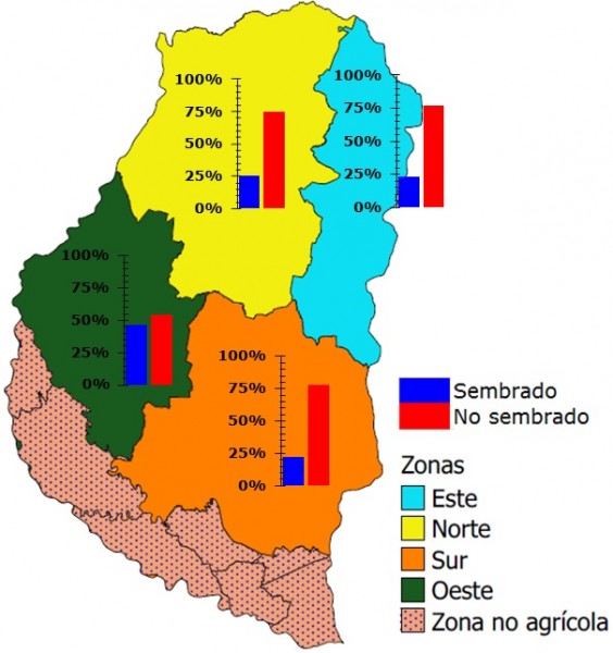 En la Figura 1 se puede apreciar el avance por zonas, donde se destaca la zona Oeste con el 45 % de la superficie sembrada.