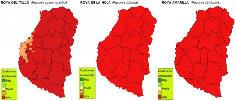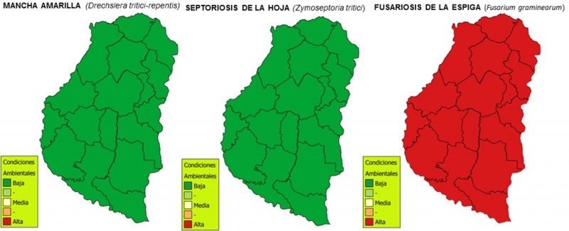 Con respecto a fusariosis de la espiga se detectaron algunas variedades con síntomas en el norte de la provincia de Santa Fe (Comunicación personal, Ing. Ana Brach, EEA Reconquista) y el riesgo climático para Entre Ríos es alto. Los controles químicos para esta enfermedad son estrictamente preventivos y se aplican cuando el trigo se encuentra entre inicios y un 50% de anteras visibles.