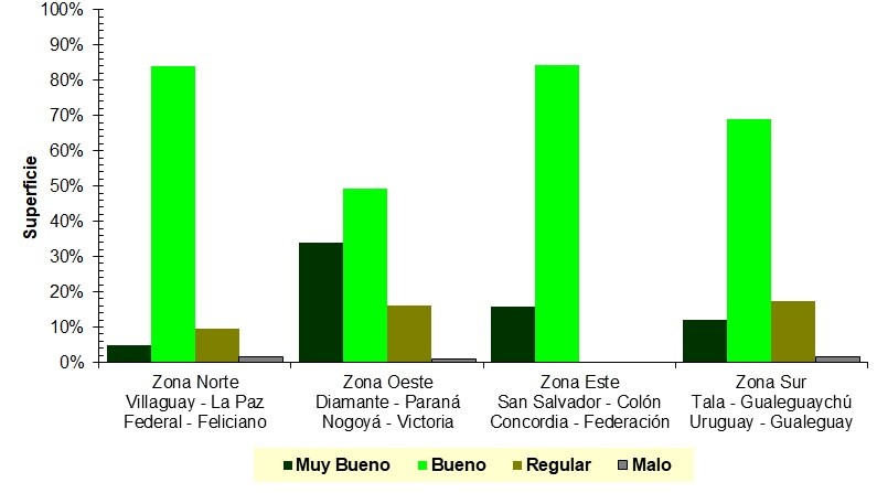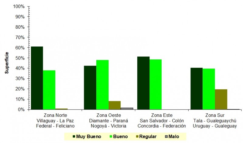 Asimismo la zona sur que comprende los departamentos Gualeguay, Gualeguaychú, Uruguay y Tala, cuentan con un 19 % de área con condición regular, esto es porque la recuperación y el estado de la soja varía mucho de acuerdo a la precipitación recibida, dado en los últimos días las lluvias han sido muy heterogéneas en ésta zona.