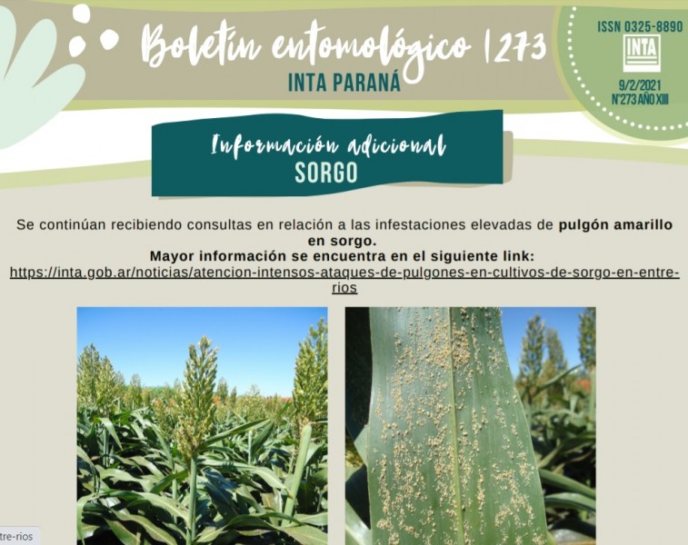 En relación a las consultas recibidas desde hace unos días sobre el tema de los pulgones en sorgo, se envía el link del Boletín Entomológico del Inta Paraná con información sobre el tema: