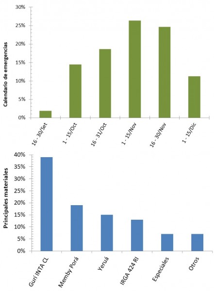 El 33 % del área encuestada presentó su emergencia en la fecha óptima (mes de octubre). La mayor concentración de emergencias se detectó en noviembre que abarco el 51 %.