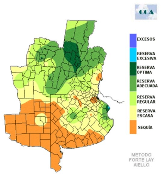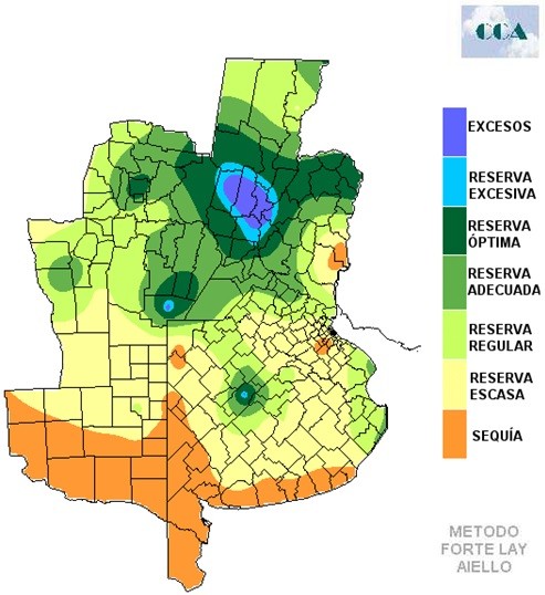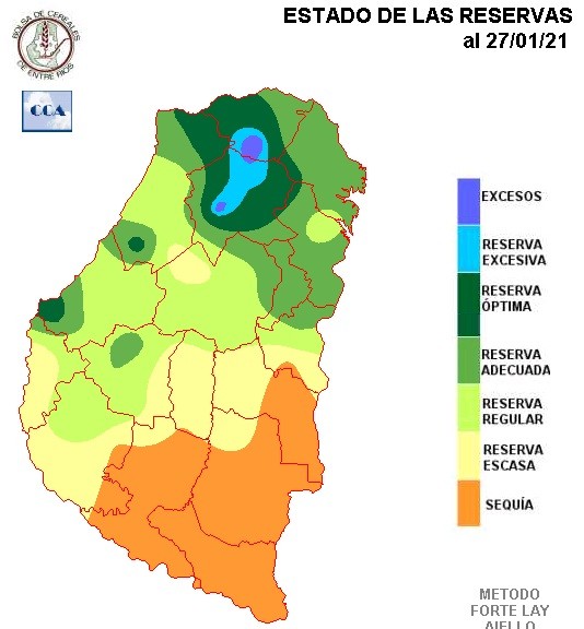 Habiendo superado la primera mitad de febrero, el balance hídrico presenta una condición de humedad que no sorprende demasiado. Las zonas más secas, seguramente algunos lotes en sequía se concentran sobre el sudeste de la provincia, mientras que la franja central de la provincia, incluyendo buena parte del sudoeste, presenta reservas entre regulares y adecuadas.