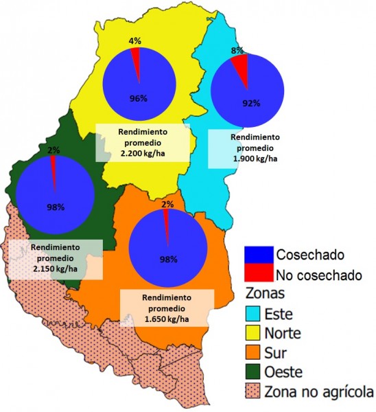 Es importante mencionar que el sector Sur, posee el rendimiento promedio más bajo con 1.650 kg/ha, lo cual muestra una merma del 24 % (510 kg/ha) con respecto al resto del territorio (ver Figura 1).